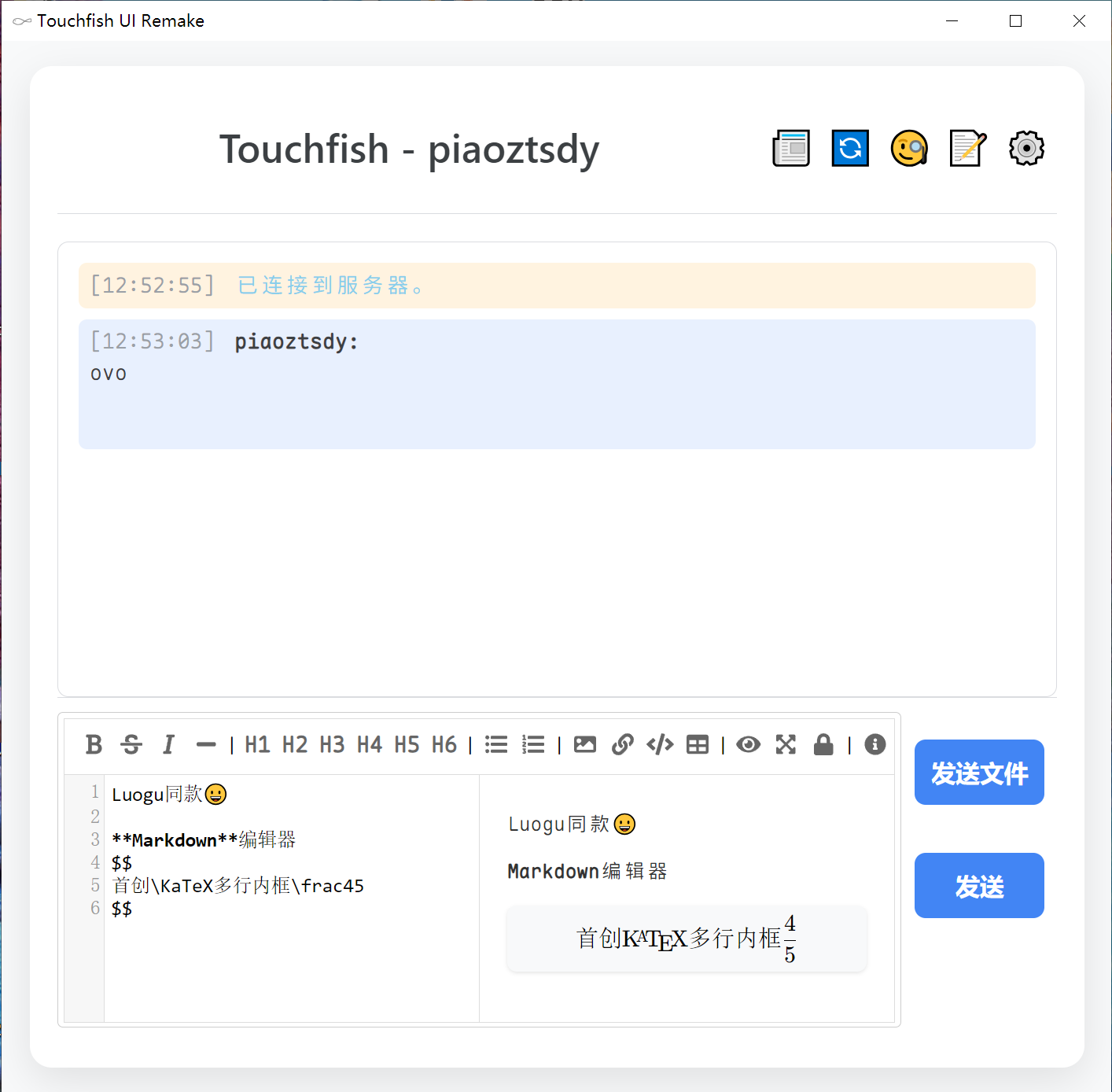 众所周知,TouchFish是用Python+Tkinter制作的,虽然简单,但是实在太丑了,并且也没啥兼容性,所以TFUR应运而生,它不仅有很美观的界面、Markdown渲染支持、KaTeX部分支持和代码高亮,还有无与伦比的性能优化(内存能压到60MB左右,超越大部分Electron应用)和差兼容性,跟TouchFish差不多,如果你想要追求兼容性,可以前往Cloud Studio Chat(打个小~广告)。